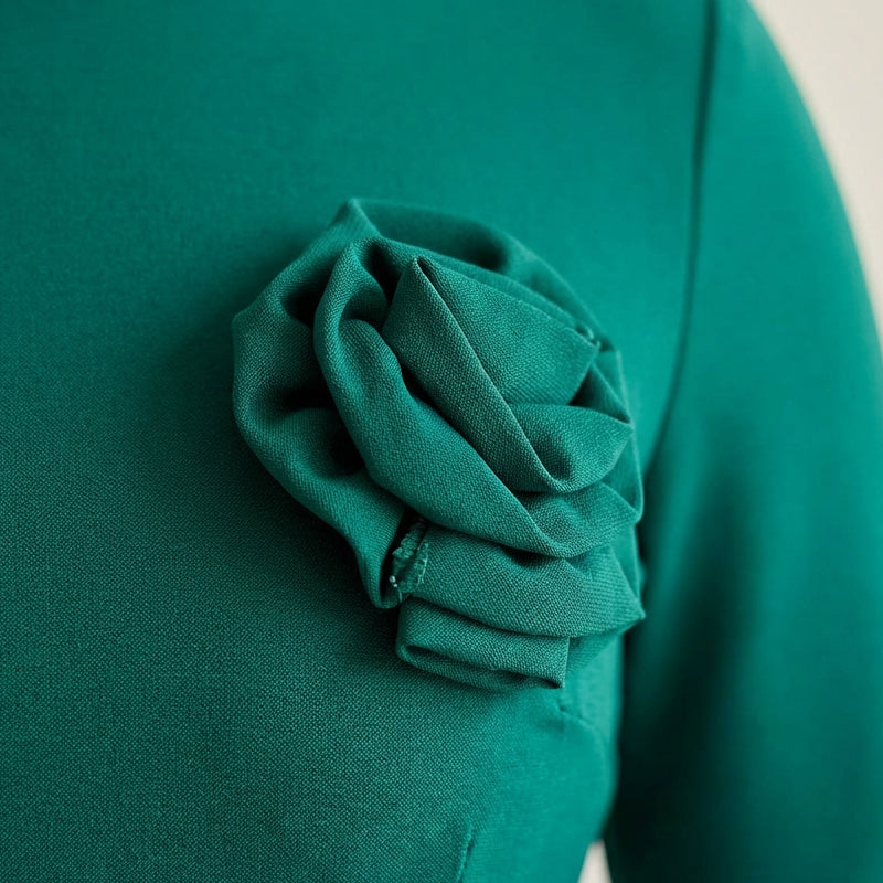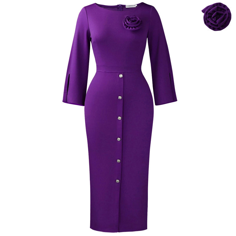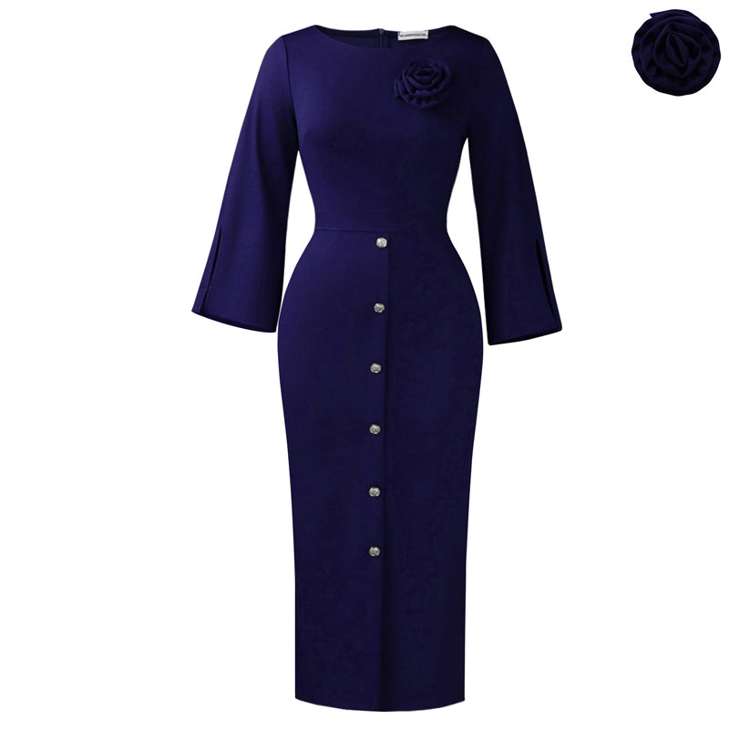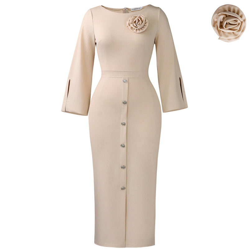 CHIC FLORAL& DECORATION - En vackert utformad stor blomma pryder bröstet och utgör en distinkt och smakfull blickfång. Denna charmiga detalj tillför en touch av romantik och unik karaktär till den klassiska klänningsdesignen.