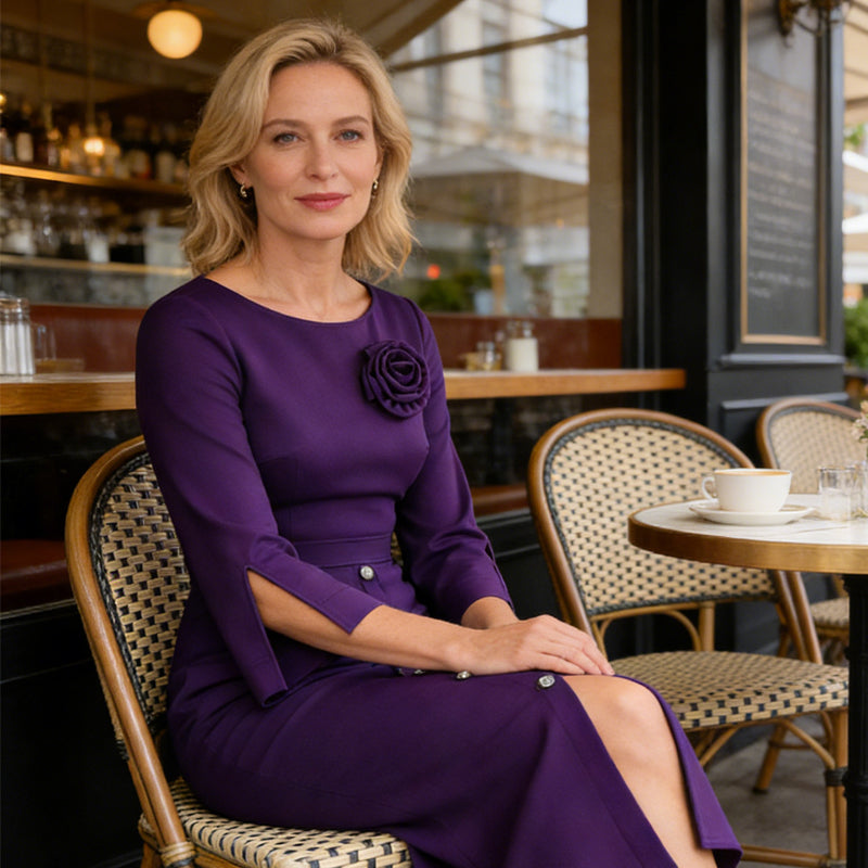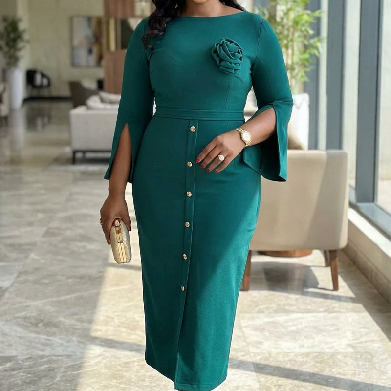MÅNGSIDIG KNÄLÅNG SKÄRNING - Den knälånga skärningen erbjuder en perfekt balans mellan diskretion och stil, vilket gör denna klänning lämplig för en rad olika tillfällen, från professionella sammanhang till formella kvällssammankomster.