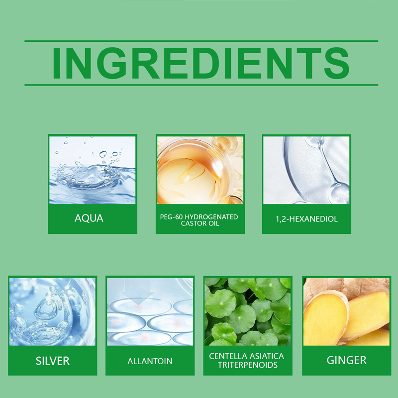 Inaktiva ingredienser: Vatten, PEG-60 hydrerad ricinolja, 1,2-hexandiol, kolloidalt silver, allantoin