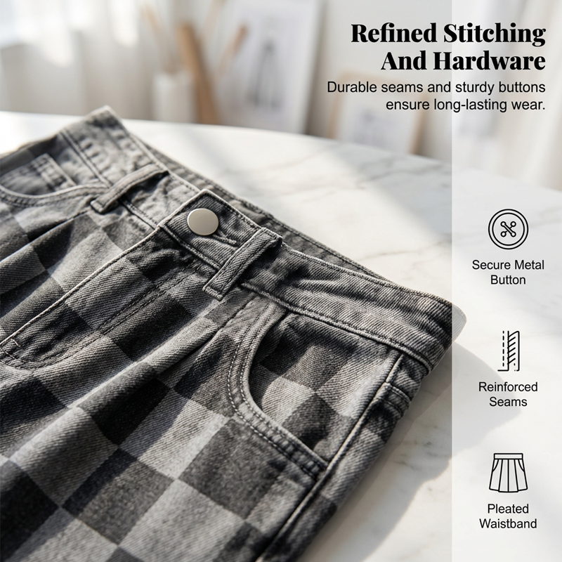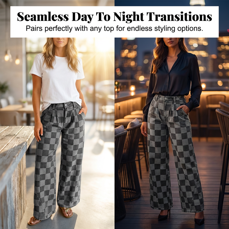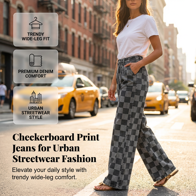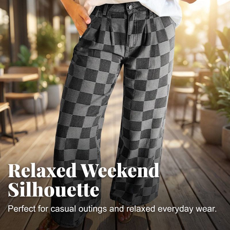 JEANS MED RUTMÖNSTER – Visa upp din stil med dessa trendiga damjeans med rutmönster, inspirerade av både europeisk och amerikansk mode. De är designade för urban streetwear och har en smickrande passform med vida ben samt erbjuder optimal komfort hela dagen.